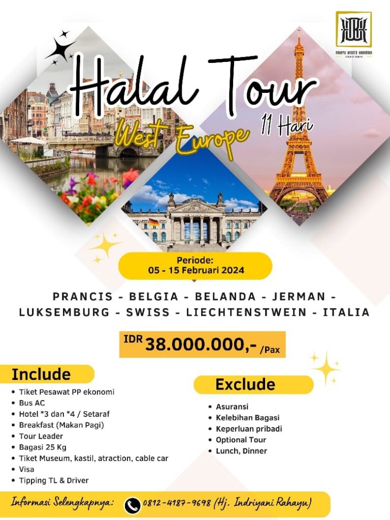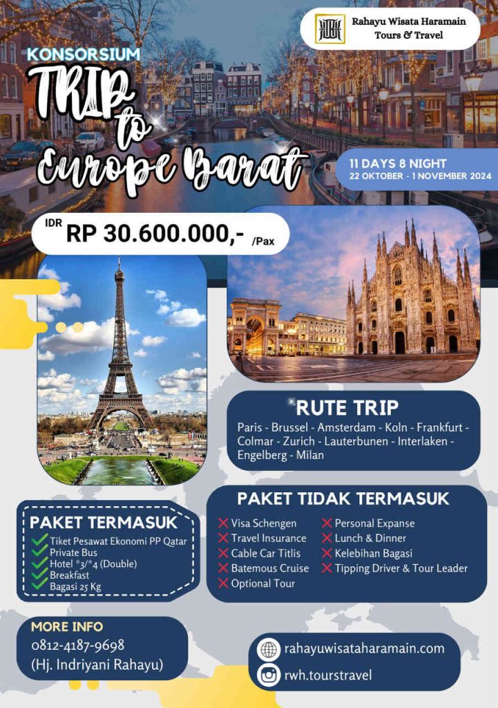 Paket halal tour di Eropa selama 11 hari bersama RWH tour & travel dengan berbagai destinasi seperti Perancis, Belgia, Belanda, Jerman, Luxemburg, Swiss, Liechtenstwen, Italia