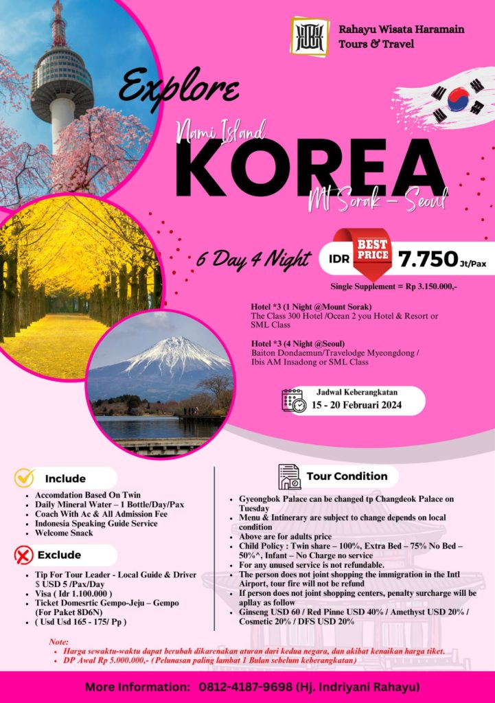 Rasakan sensasi trip di Korea Selatan dengan mengunjungi tempat destinasi yang terbaik di Korea Selatan. Paket selama 6 hari 4 malam.