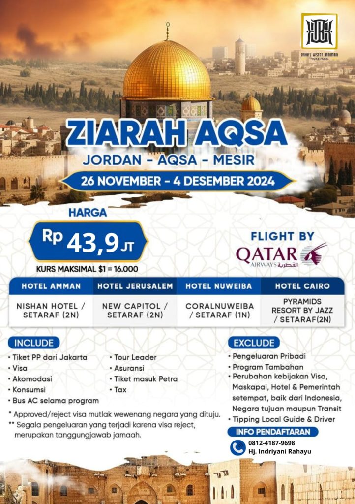 Paket ziarah Aqsa di bulan Novmber dan Desember dengan destinasi Jordan, Aqsa, dan Mesir. Harga 43jutaan saja. Buruan di booking!