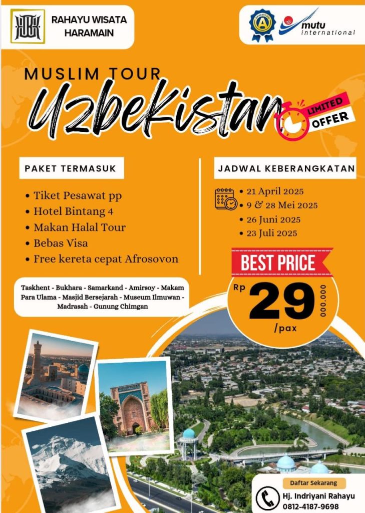Nikmati wisata muslim di Uzbekistan dengan banyak pilihan destinasi wisata. Tersedia berbagai jadwal keberangkatan serta harga paket yang terjangkau.